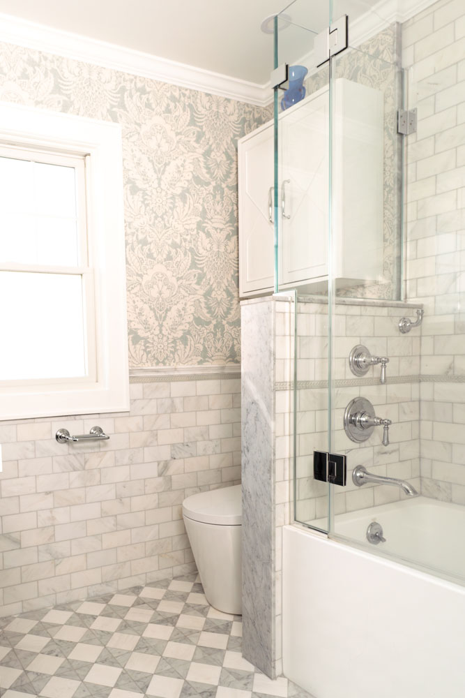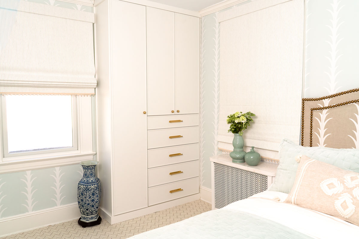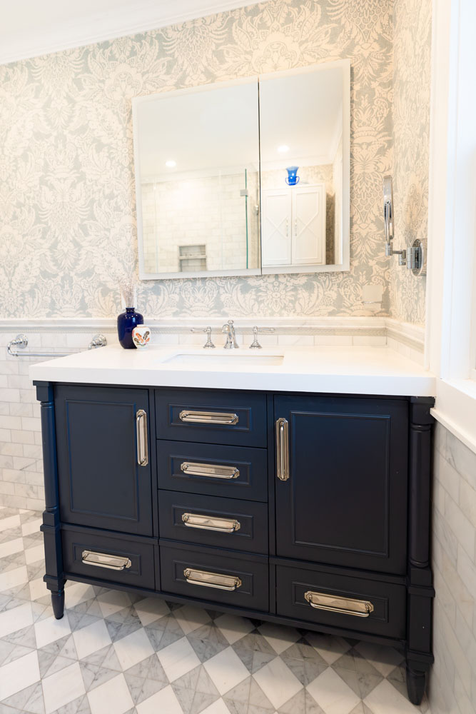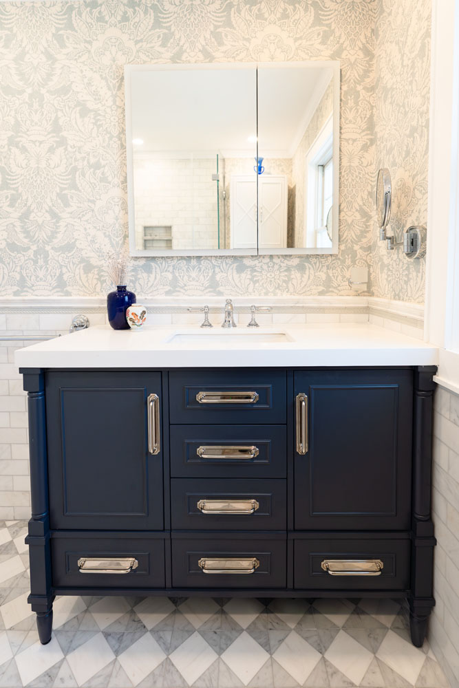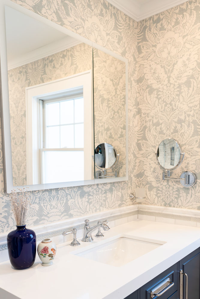 For this home, we transformed both the guest bedroom and guest bathroom into refined, welcoming spaces designed with comfort and beauty in mind. The guest bedroom was reimagined as a calming retreat—functional yet indulgent—where thoughtful planning and creative storage solutions make the most of a compact footprint without sacrificing style. Layered textures, tailored details, and a luxury hotel–inspired atmosphere create a space so comfortable and serene that guests may never want to leave. The guest bathroom underwent a complete gut renovation, allowing us to improve both layout and function with a larger vanity and carefully selected finishes. Classic Carrara marble grounds the design in timeless elegance, while soft blue and gray tones are enhanced by subtle wallpaper texture, adding depth and warmth to a space that feels both fresh and enduring.