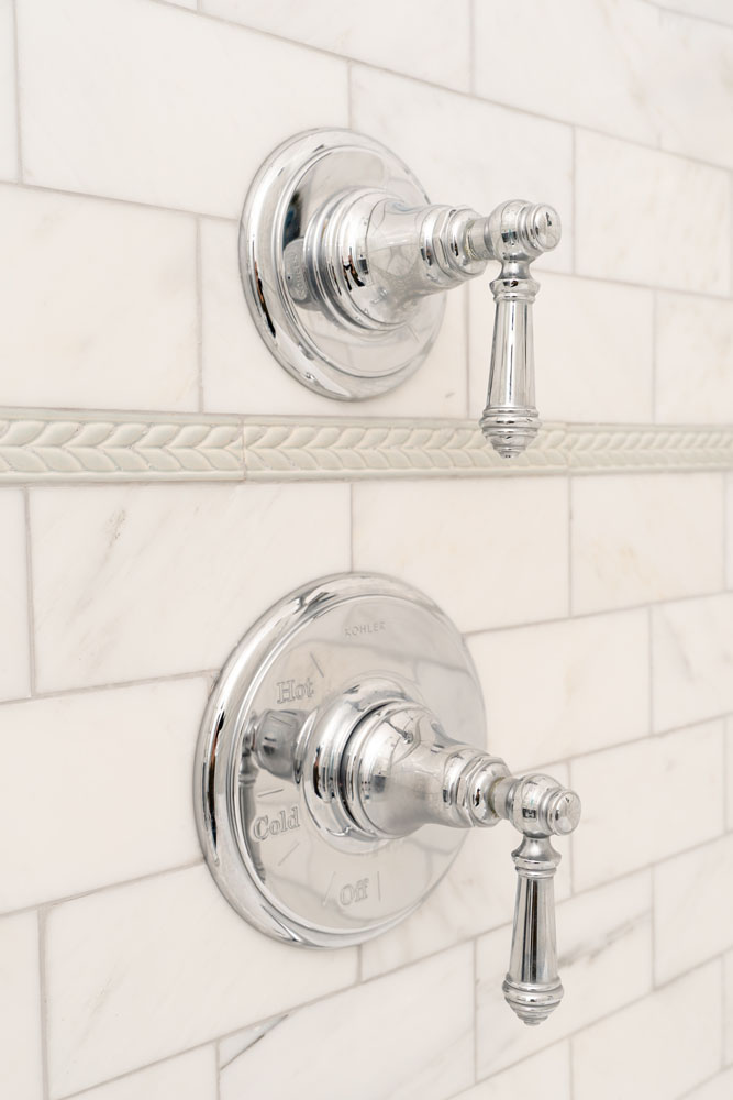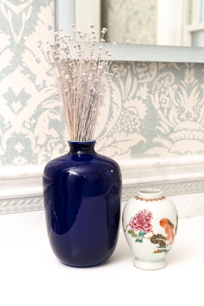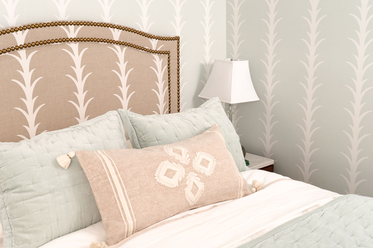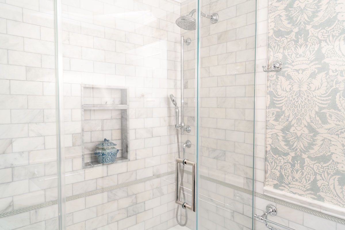 For this home, we transformed both the guest bedroom and guest bathroom into refined, welcoming spaces designed with comfort and beauty in mind. The guest bedroom was reimagined as a calming retreat—functional yet indulgent—where thoughtful planning and creative storage solutions make the most of a compact footprint without sacrificing style. Layered textures, tailored details, and a luxury hotel–inspired atmosphere create a space so comfortable and serene that guests may never want to leave. The guest bathroom underwent a complete gut renovation, allowing us to improve both layout and function with a larger vanity and carefully selected finishes. Classic Carrara marble grounds the design in timeless elegance, while soft blue and gray tones are enhanced by subtle wallpaper texture, adding depth and warmth to a space that feels both fresh and enduring.